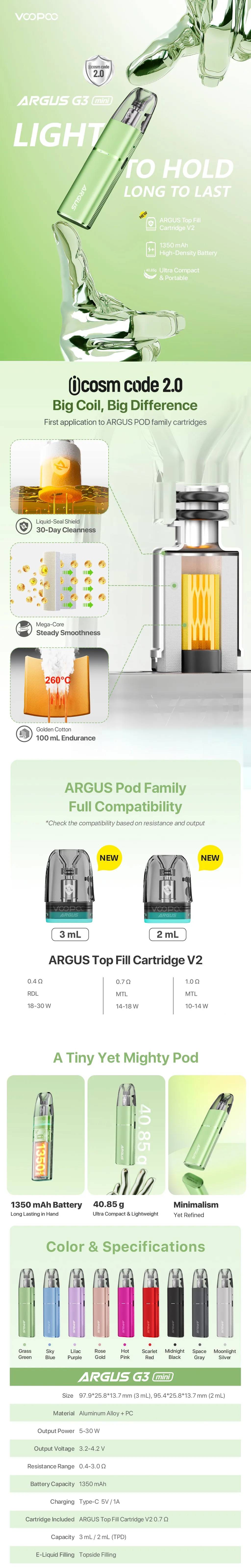 Voopoo Argus G3 Mini با ابعادی فوقالعاده کوچک (حدود 10.5 × 2.3 × 3.3 سانتیمتر) و وزنی تنها 40.85 گرم، سبکترین پاد سیستم در سری Argus به شمار میرود. بدنه آن از آلیاژ آلومینیوم با روکش مات ساخته شده که در رنگهای متنوعی مانند مشکی، نقرهای، آبی و سبز عرضه میشود.