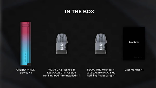پاد سیستم کالیبرن ای 2 اس یوول (UWELL CALIBURN A2 S) یکی از محصولات اقتصادی برند یوول است که دارای باتری داخلی با ظرفیت 520 میلی آمپر قابل شارژ است. شارژ کامل دستگاه در 30 دقیقه، حداکثر توان خروجی 15 وات میباشد. بدنه این دستگاه از جنس PCTG و آلیاژ آلومینیوم ، با وزن 30 گرم ساخته شده است و ظرفیت مخزن 2 میلی لیتر میباشد. در قسمت جلویی یک چراغ LED نشانگر عمر باتری و هشدار ها قرار دارد. ، یک پورت شارژ Type-C در پایین دستگاه قرار دارد.